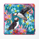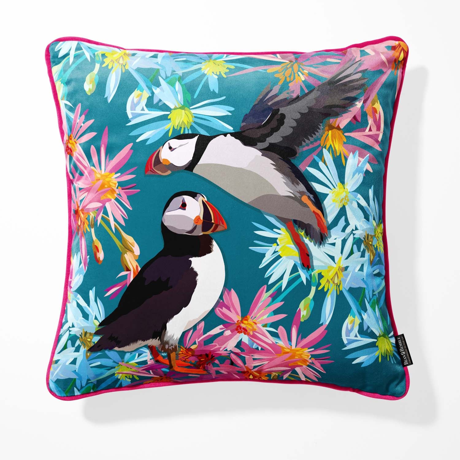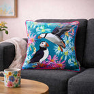 Bring a joyful coastal touch to your home with this aqua blue velvet puffin cushion. Featuring charming puffins surrounded by colourful wildflowers, this vibrant design captures the playful spirit of seabirds against a summery turquoise background.