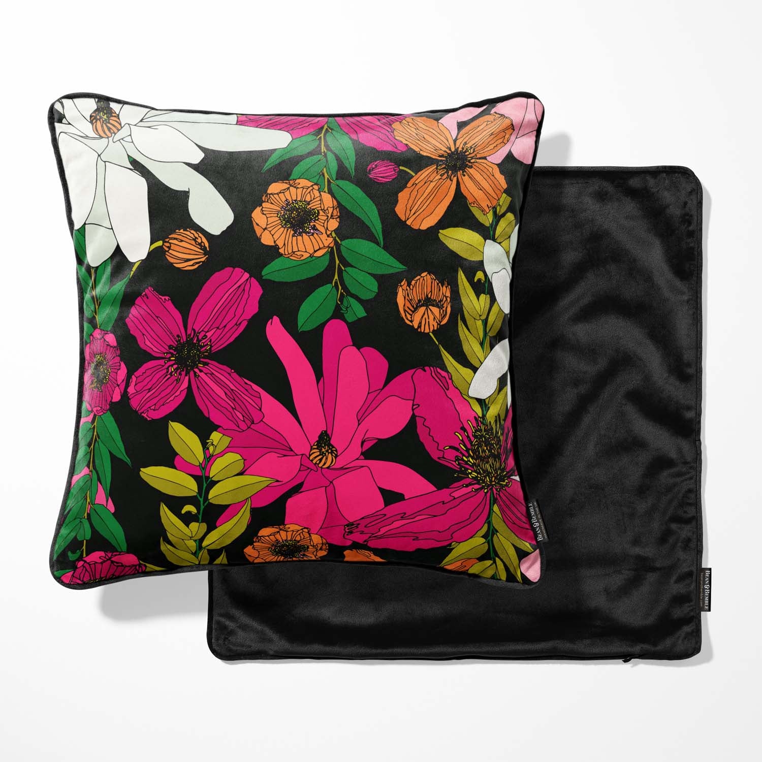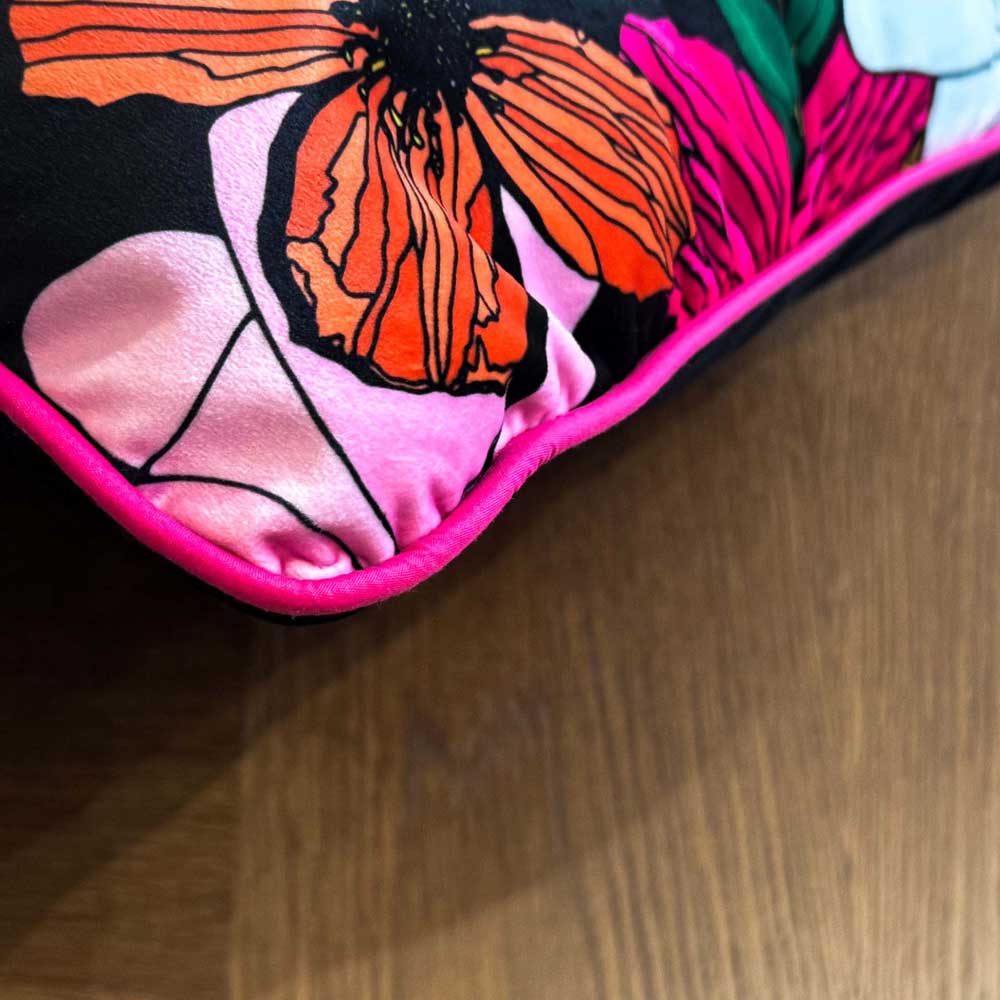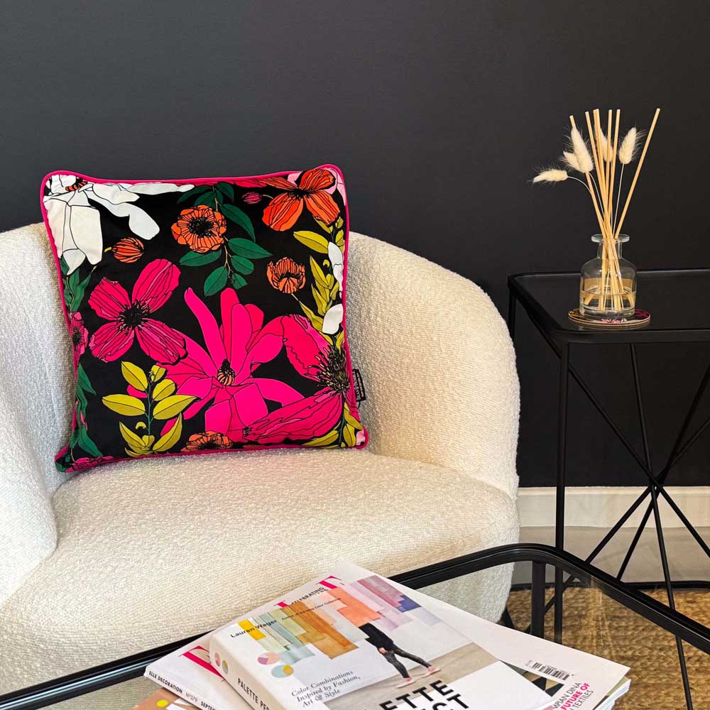 Bring bold florals into your home with our luxurious Vivid Garden Blooms velvet cushion. This vibrant design features hand-drawn flowers in fuchsia, orange, and white against a dramatic black background—perfect for adding a burst of colour to spring and summer home decor.