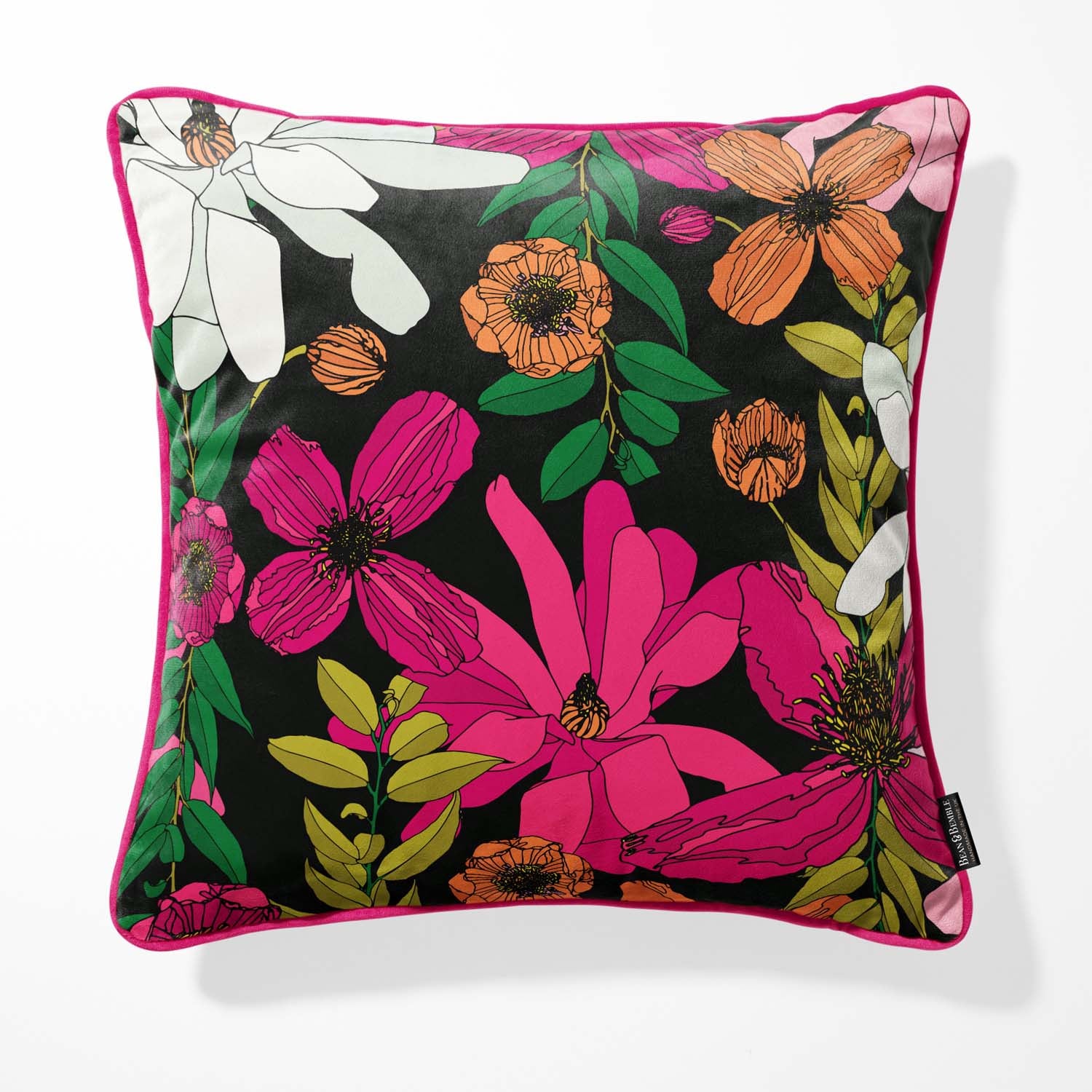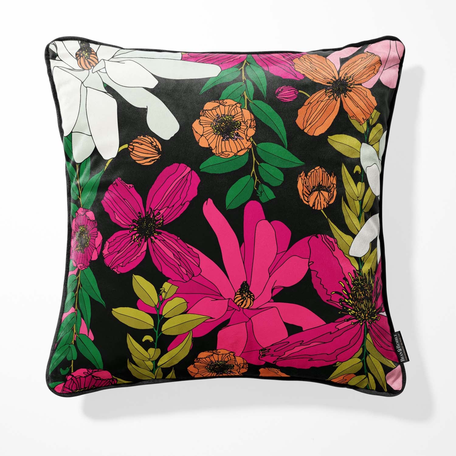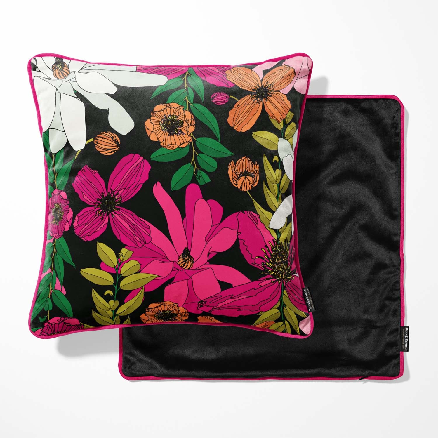 Bring bold florals into your home with our luxurious Vivid Garden Blooms velvet cushion. This vibrant design features hand-drawn flowers in fuchsia, orange, and white against a dramatic black background—perfect for adding a burst of colour to spring and summer home decor.