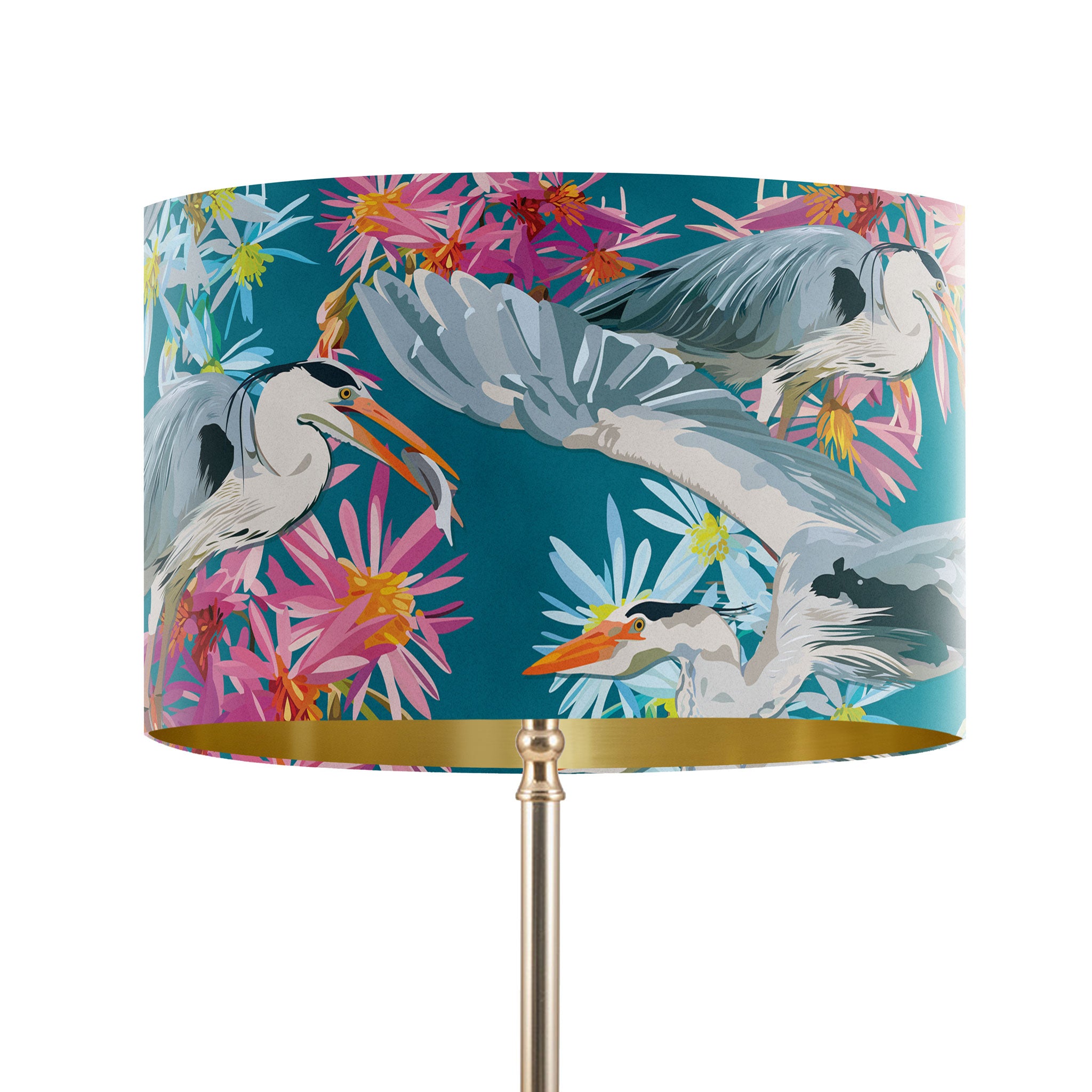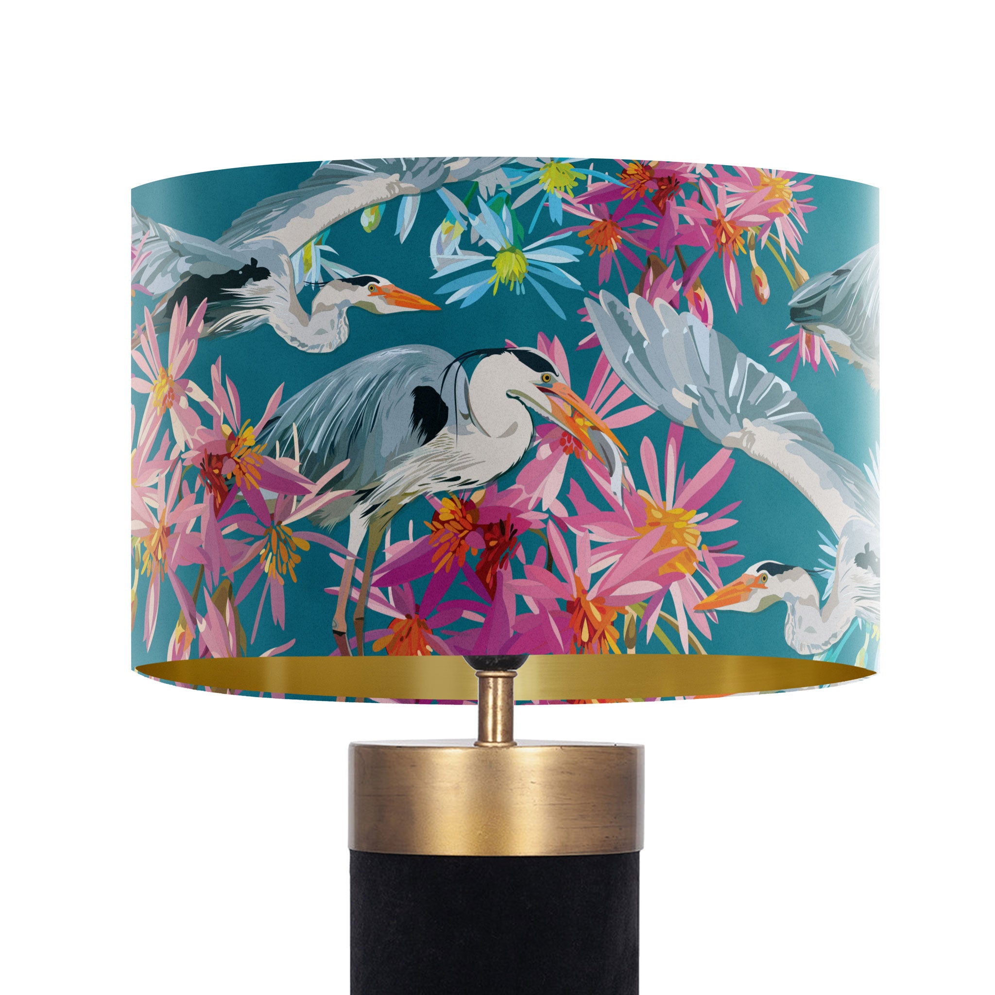 This Grey Heron Teal Velvet Lampshade features Michelle's elegant illustrated herons set against a rich teal backdrop, surrounded by expressive pink and soft blue florals. The combination of graceful birds and layered colour creates a striking yet balanced design, bringing movement, depth and a calm sense of drama to your space.