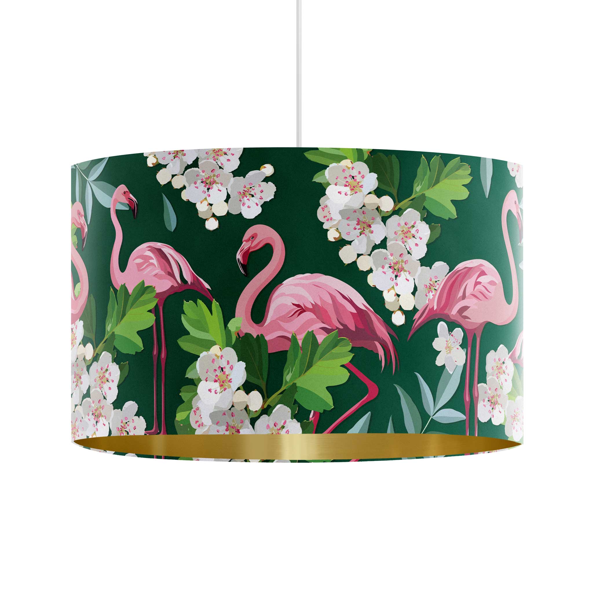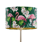 Add playful personality to your lighting with our Pink Flamingo lampshade with a green base colour. Made from beautifully soft velvet, this eye-catching design features elegant pink flamingos set against a deep green backdrop, layered with leafy foliage and delicate white blossoms. The rich colour contrast brings depth and character to a room, making it ideal for those who love bold colour, maximalist interiors and dopamine decor. A striking statement piece that adds charm, colour and a touch of fun to any space.