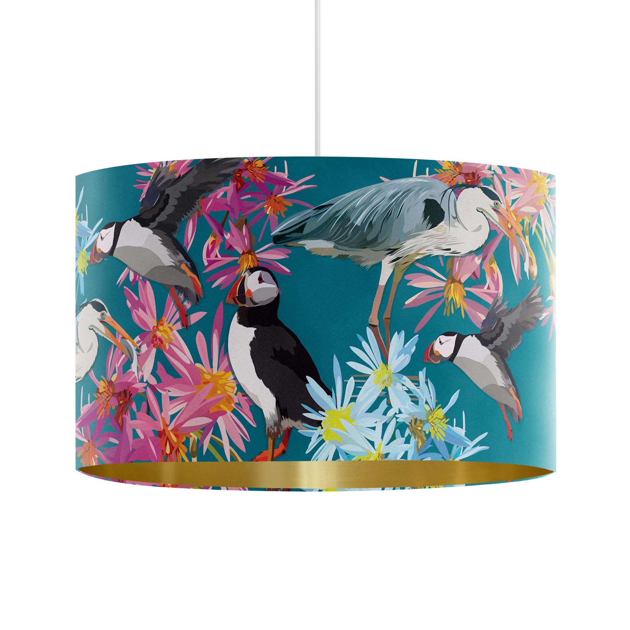 Bring the beauty of the British coast into your home with our Puffins and Grey Herons lampshade, printed onto lovely patterned teal velvet. Featuring a delightful scene of puffins and herons nestled among vibrant seaside wildflowers, this playful, nature-inspired design will add personality, colour and a touch of luxurious charm to your room.