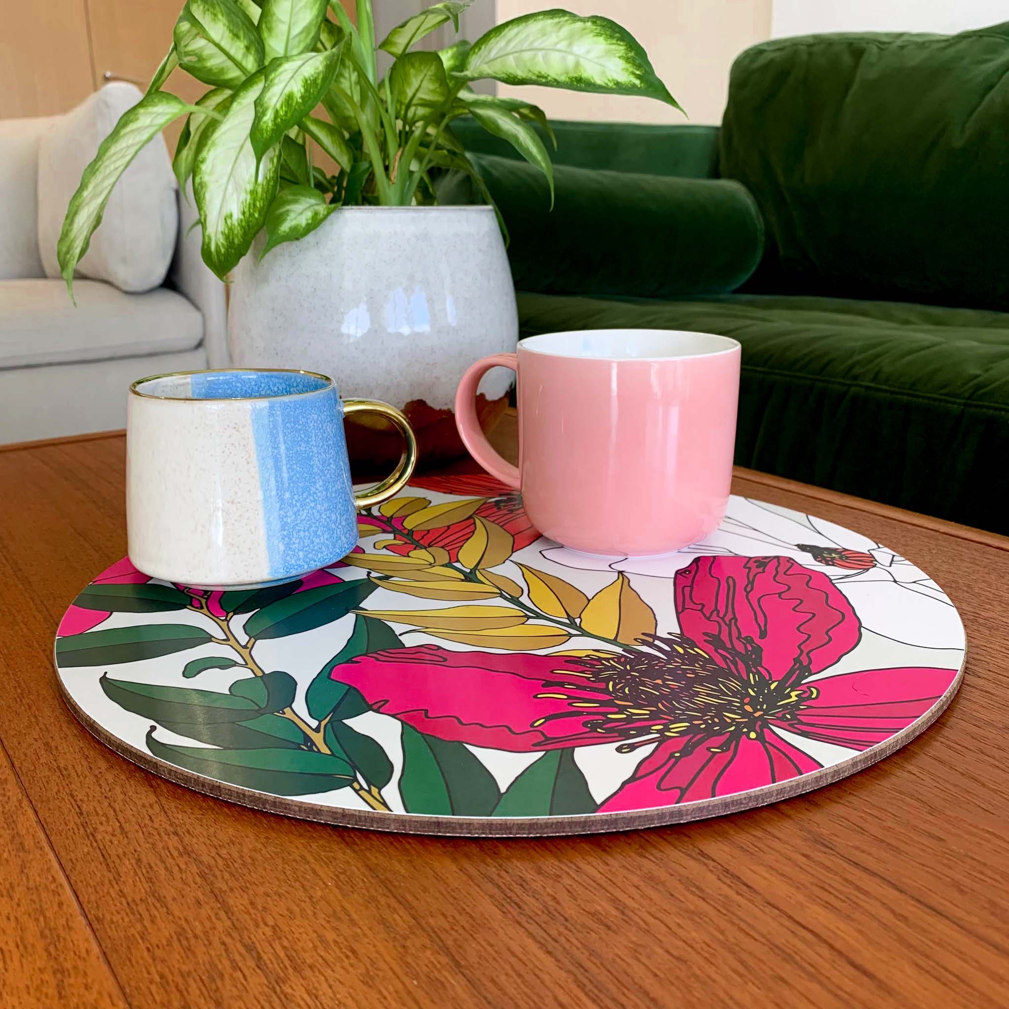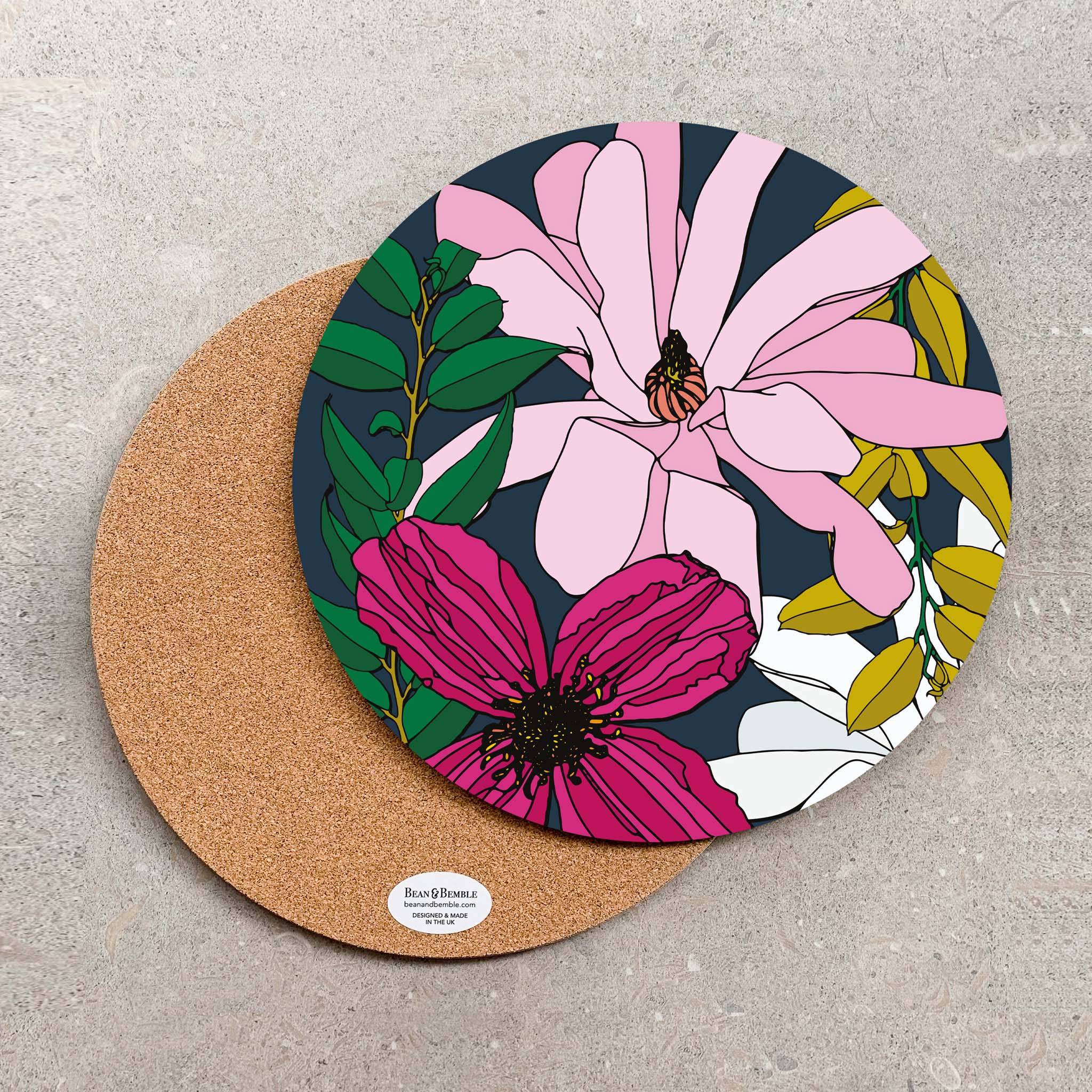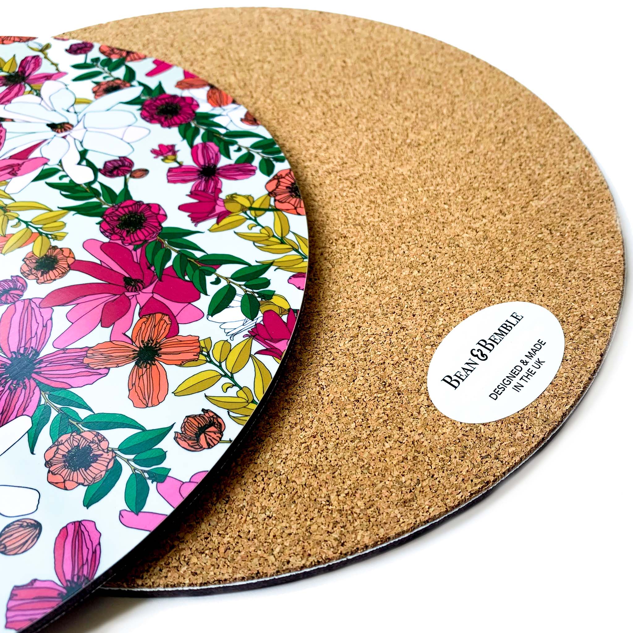 Bean and Bemble’s placemat collection brings vibrant style and practicality to your table. Choose from round or rectangular placemats, all handcrafted in the UK with striking, contemporary designs. Made with a heatproof, stain-resistant baked melamine surface and a sustainable eucalyptus core, these durable placemats protect your surfaces while adding a bold, colourful touch.