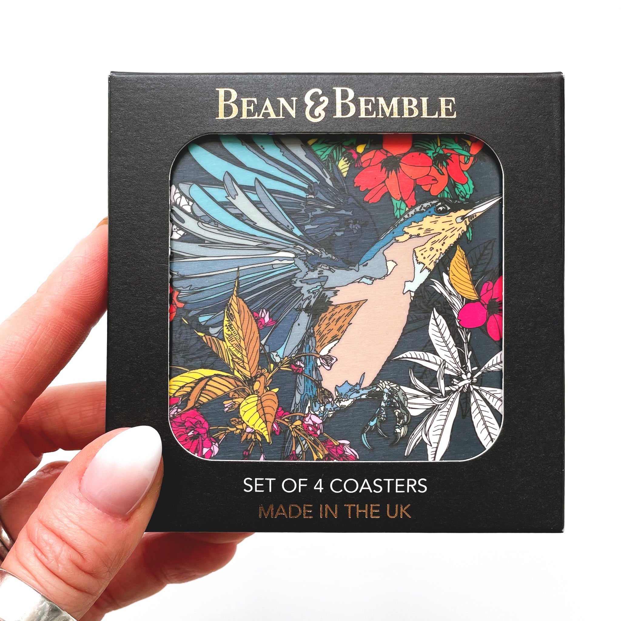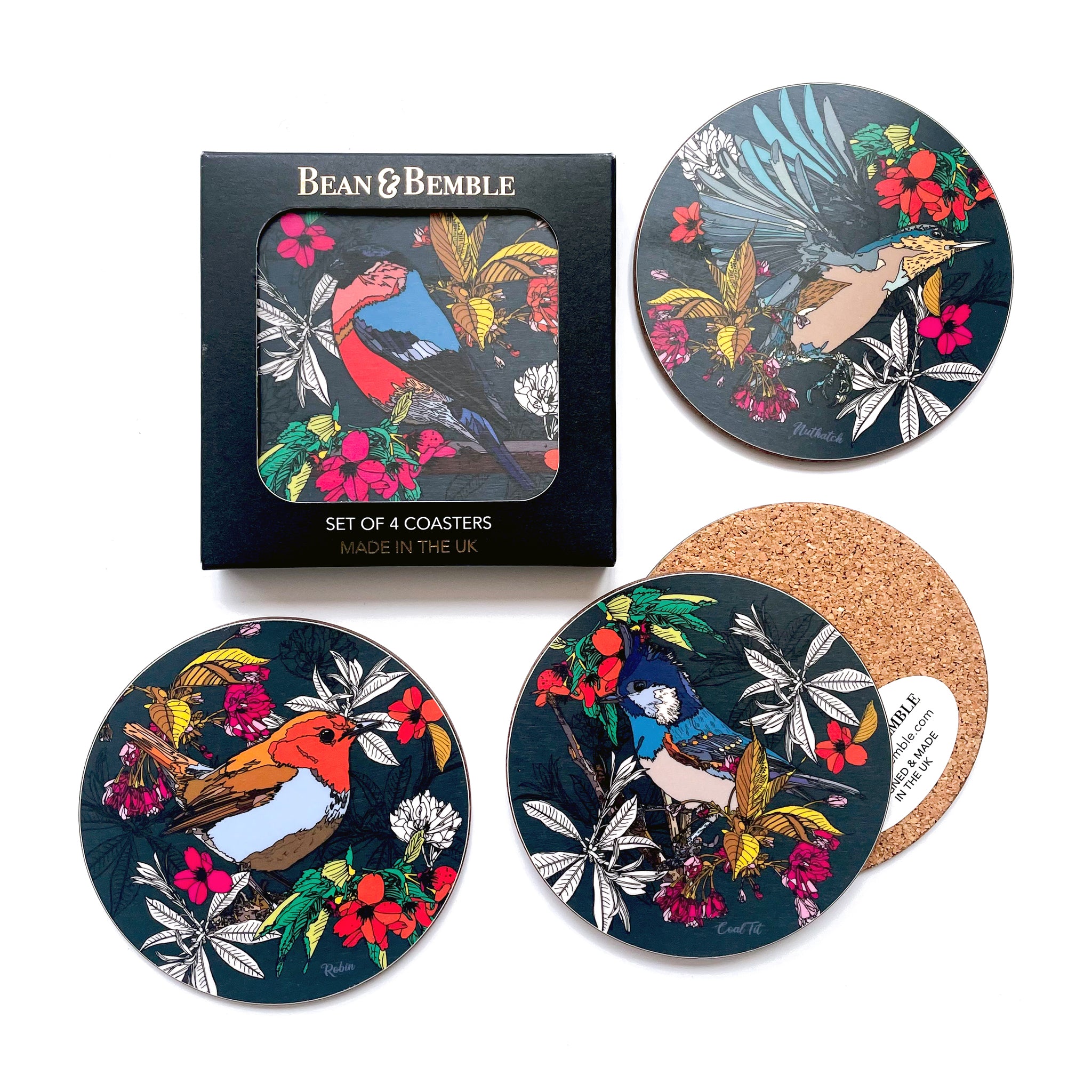 コースター 4 枚パック (デザインごとに 1 枚)美しい Bean and Bemble の金箔押しボックスに入れてお届けします。