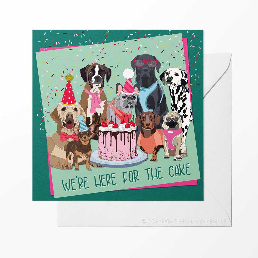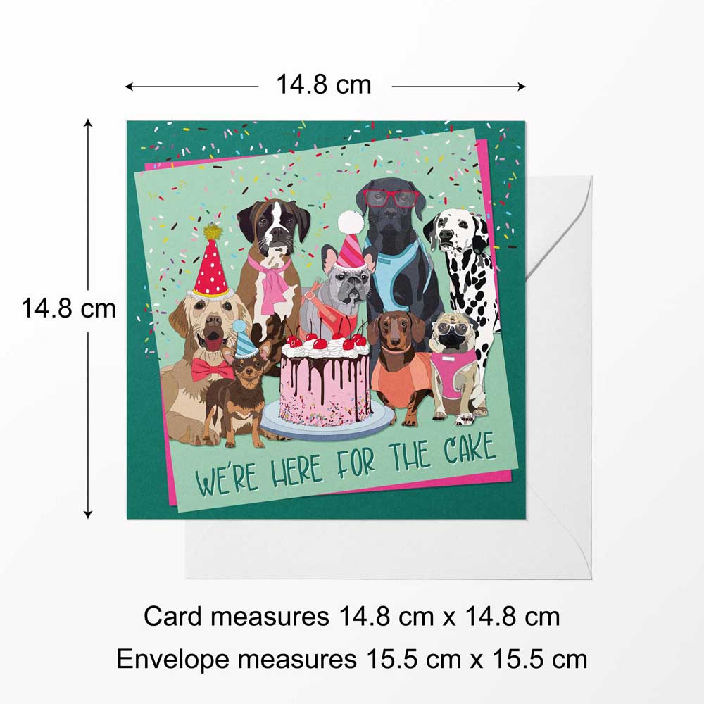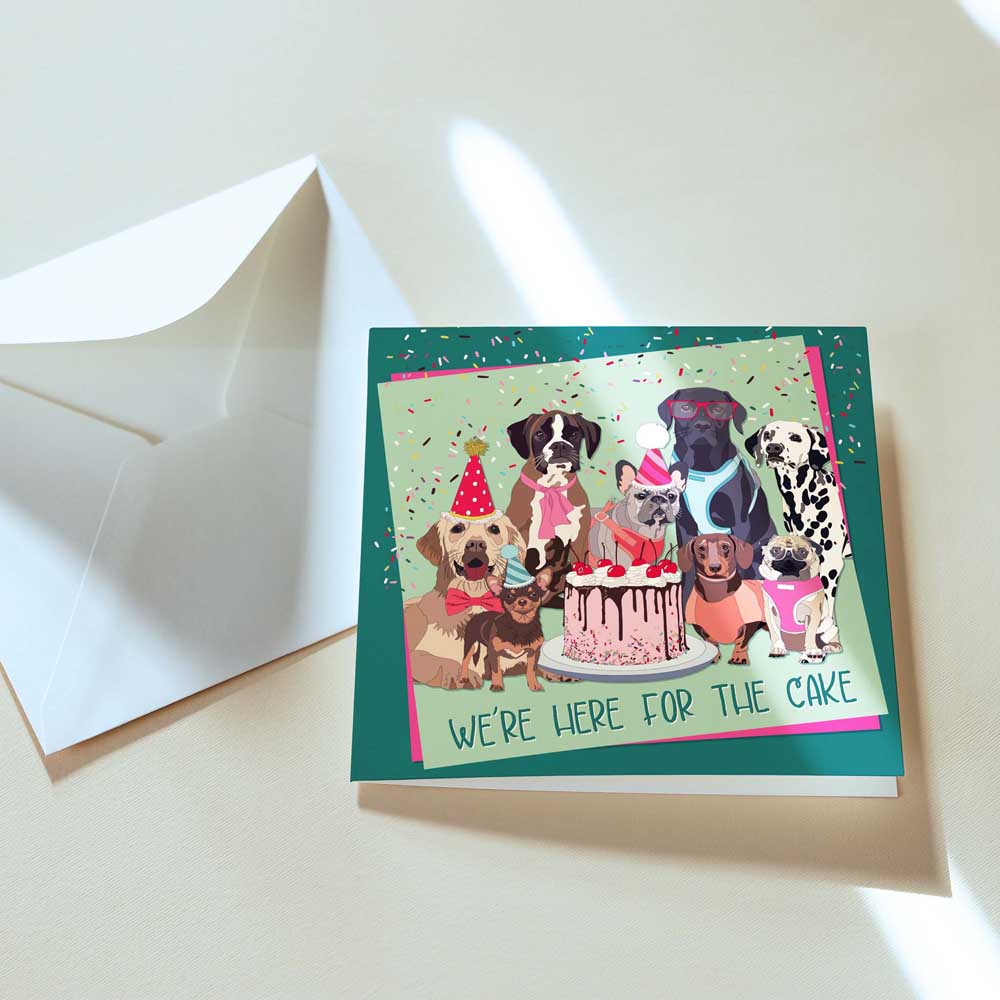Looking for the perfect card to celebrate any occasion with a dash of doggy charm? Our "We're Here for the Cake" greeting card is a delightful choice for dog lovers! Featuring a colourful, hand-illustrated group of party-ready pups, complete with party hats, a cake, and a sprinkle of fun, this card is perfect for birthdays, celebrations, or simply sending congratulations.
